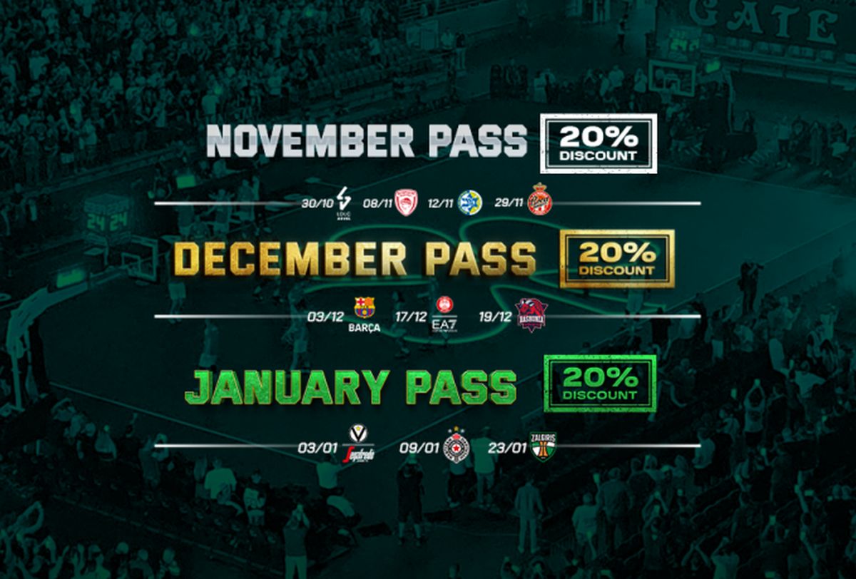 Συγκεκριμένα, θα τεθούν σε κυκλοφορία τρία μηνιαία πακέτα εισιτηρίων, το November Pass, το December Pass και το January Pass, με τα οποία οι φίλαθλοί μας θα εξασφαλίζουν την παρουσία τους στο νέο και εντυπωσιακό ΟΑΚΑ, για όλους τους εντός έδρας αγώνες του εκάστοτε μήνα, επωφελούμενοι έκπτωσης 20%!