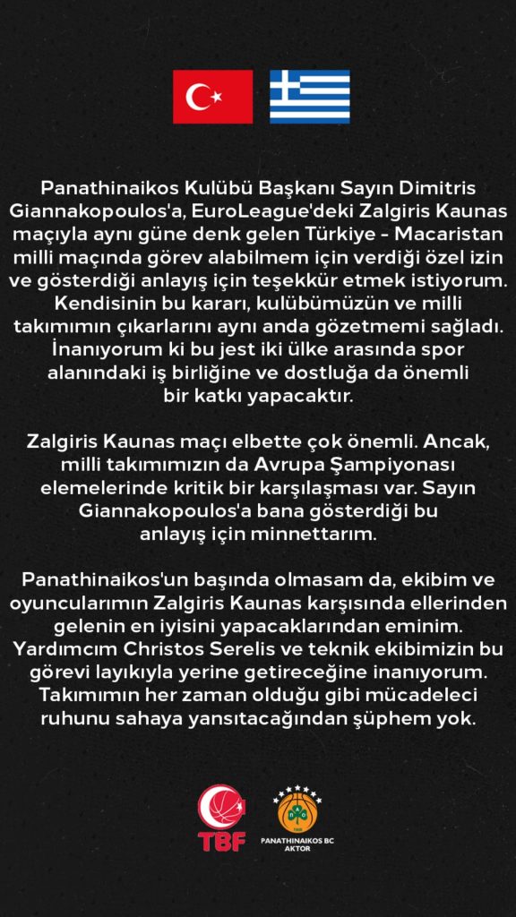 «Θα ήθελα να ευχαριστήσω τον πρόεδρο του Παναθηναϊκού, κύριο Δημήτρη Γιαννακόπουλο, για την κατανόηση και την ειδική άδεια που μου έδωσε για να είμαι στην εθνική ομάδα της Τουρκίας στο παιχνίδι κόντρα στην Ουγγαρία, που συμπίπτει με το παιχνίδι μας στην Ευρωλίγκα κόντρα στη Ζαλγκίρις Κάουνας. Η απόφασή του μου επέτρεψε να εξυπηρετήσω τα συμφέροντα τόσο του συλλόγου μας όσο και της εθνικής μου ομάδας. Ταυτόχρονα, αυτή η κίνηση είναι μια σημαντική συνεισφορά στη συνεργασία και στη φιλία ανάμεσα στις δύο χώρες σε αθλητικό επίπεδο.