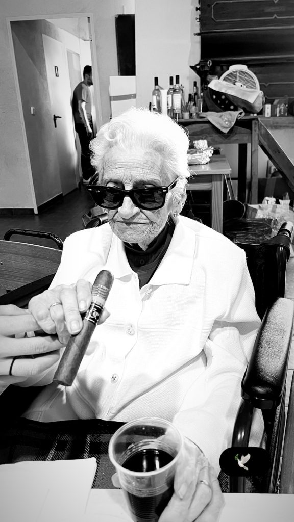 Στη φωτογραφία η γιαγιά του Χουάντσο Ερνανγκόμεθ φοράει γυαλιά ηλίου που είναι πιθανότατα του ίδιου, ενώ κρατάει και ένα πούρο στο χέρι της.