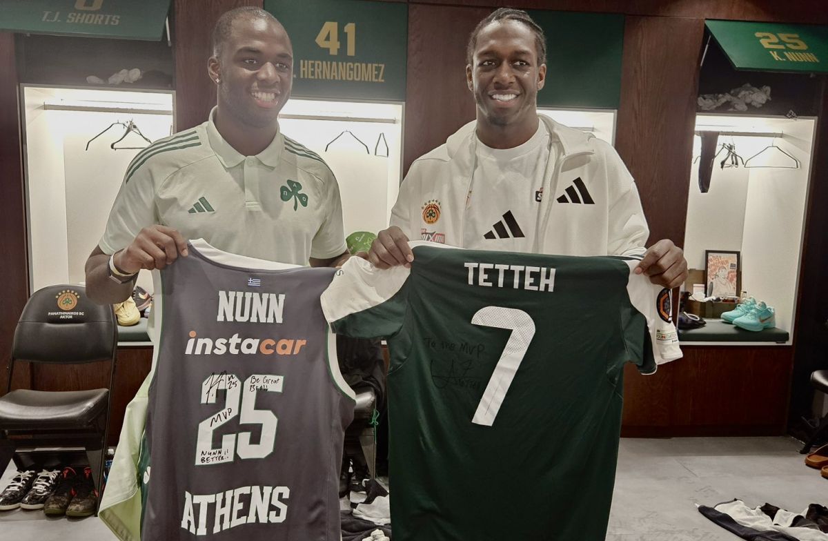«Ευχαριστώ MVP», ανέφερε στο μήνυμά του ο Ανδρέας Τετέι, που πήρε δώρο μια υπογεγραμμένη φανέλα του Κέντρικ Ναν, δίνοντας στον Αμερικανό γκαρντ μια δική του φανέλα.